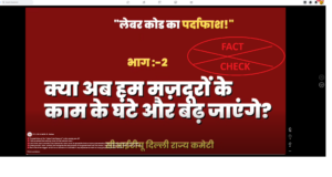 ಹೇಳಿಕೆ/Claim:ಭಾರತದಲ್ಲಿ ಹೊಸದಾಗಿ ಜಾರಿಗೆ ತಂದ ಕಾರ್ಮಿಕ ಸಂಹಿತೆಗಳು ಕಾರ್ಖಾನೆ ಮಾಲೀಕರು ಕಾರ್ಮಿಕರಿಗೆ ವಿಶ್ರಾಂತಿ ಅವಧಿಗಳು ಮತ್ತು ವಿಸ್ತೃತ ಕೆಲಸದ ಅವಧಿಗಳನ್ನು ಏಕಪಕ್ಷೀಯವಾಗಿ ನಿಗದಿಪಡಿಸುವ ಅಧಿಕಾರ ನೀಡುತ್ತವೆ, ಇದು ಅವರು 8 ಗಂಟೆಗಳ ಅವಧಿಗೆ ಮಾತ್ರ ವೇತನ ಪಾವತಿಸಿ 12 ಗಂಟೆಗಳ ಪಾಳಿಗಳನ್ನು ಕಡ್ಡಾಯಗೊಳಿಸಲು ಅನುವು ಮಾಡಿಕೊಡುತ್ತದೆ ಎಂದು CITU ದೆಹಲಿ ಹಂಚಿಕೊಂಡ ವೀಡಿಯೊ ಹೇಳುತ್ತದೆ. ಕಡೆನುಡಿ/Conclusion: ಹೇಳಿಕೆ ದಾರಿತಪ್ಪಿಸುವಂತಿದೆ. ನವೆಂಬರ್ 21, 2025 ರಿಂದ ಜಾರಿಗೆ ಬಂದ ಔದ್ಯೋಗಿಕ ಸುರಕ್ಷತೆ, ಆರೋಗ್ಯ ಮತ್ತು ಕೆಲಸದ ಪರಿಸ್ಥಿತಿಗಳ ಸಂಹಿತೆ, 2020, ಅಂತಹ ಯಾವುದೇ ಏಕಪಕ್ಷೀಯ ಕೆಲಸದ ...