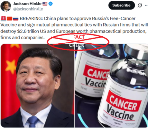 ಹೇಳಿಕೆ/Claim: ಚೀನಾ ದೇಶವು US ಮತ್ತು ಯುರೋಪ್ ಔಷಧ ಉದ್ಯಮವನ್ನು ನಾಶಪಡಿಸುವಂತಹ ರಷ್ಯಾದ ಉಚಿತ-ಕ್ಯಾನ್ಸರ್ ಲಸಿಕೆಯನ್ನು ಅನುಮೋದಿಸಿ, ರಷ್ಯಾದ ಸಂಸ್ಥೆಗಳೊಂದಿಗೆ ಪರಸ್ಪರ ಔಷಧೀಯ ಸಂಬಂಧಗಳಿಗೆ ಸಹಿ ಹಾಕಲು ಯೋಜಿಸಿದೆ. ಕಡೆನುಡಿ/Conclusion: ಹೇಳಿಕೆ ಸುಳ್ಳು. ಅಂತಹ ಅನುಮೋದನೆ ಬಂದಿದೆ ಎಂದು ದೃಢೀಕರಿಸಲು ಯಾವುದೇ ಅಧಿಕೃತ ಹೇಳಿಕೆಗಳಿಲ್ಲ. ರಷ್ಯಾ ಮತ್ತು ಚೀನಾ ವೈಯಕ್ತಿಕಗೊಳಿಸಿದ ಕ್ಯಾನ್ಸರ್ ಚಿಕಿತ್ಸೆಯಲ್ಲಿ ಒಟ್ಟುಗೂಡಿ ಕೆಲಸ ಮಾಡುತ್ತಿವೆ ಮತ್ತು ಜನವರಿ 9, 2026 ರಂದು, ಚೀನಾ ಮತ್ತು ರಷ್ಯಾ ಲಸಿಕೆ ಅಭಿವೃದ್ಧಿಯ ಕುರಿತು ಜಂಟಿಯಾಗಿ ಅಧ್ಯಯನ ಮಾಡಲು ಮತ್ತು ಸಹಕಾರವನ್ನು ಬಲಪಡಿಸಲು ಒಪ್ಪಿಕೊಂಡಿವೆ. ಪ್ರಸ್ತುತ ...