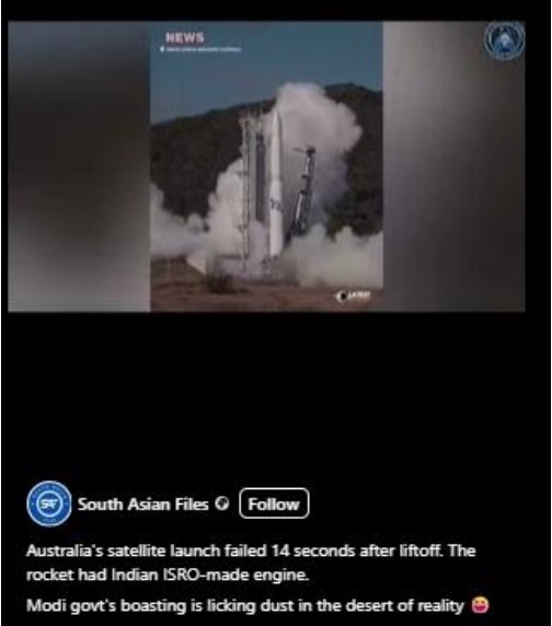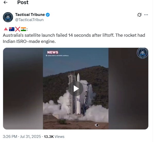 ಈ ರಾಕೆಟ್ ಅನ್ನು ಗಿಲ್ಮೋರ್ ಸ್ಪೇಸ್ ಟೆಕ್ನಾಲಜೀಸ್ ತಯಾರಿಸಿತ್ತು ಆದರೆ ಅಪಘಾತಕ್ಕೆ ಭಾರತೀಯ ನಿರ್ಮಿತ ಎಂಜಿನ್ ಕಾರಣ ಎಂದು ಈ ಹೇಳಿಕೆಯು ಸೂಚಿಸುತ್ತದೆ. ‘ಟ್ಯಾಕ್ಟಿಕಲ್ ಟ್ರಿಬನ್’ ಎಂಬ ಹ್ಯಾಂಡಲ್ನ X ಖಾತೆಯು ಇದನ್ನು ಹಂಚಿಕೊಂಡಿದ್ದು, ಆಸ್ಟ್ರೇಲಿಯಾದ ಉಪಗ್ರಹ ಉಡಾವಣೆಯಾದ 14 ಸೆಕೆಂಡುಗಳ ನಂತರ ವಿಫಲವಾಗಿದೆ ಮತ್ತು ರಾಕೆಟ್ ಇಸ್ರೋ ನಿರ್ಮಿತ ಎಂಜಿನ್ ಅನ್ನು ಹೊಂದಿತ್ತೆಂದು ಹೇಳಿದೆ. ಪೋಸ್ಟ್ ಅನ್ನು ಇಲ್ಲಿ ನೋಡಿ.