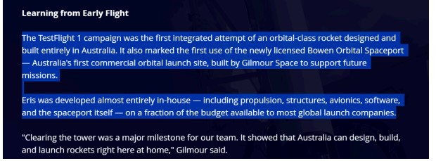 “ಆರ್ಬಿಟಲ್-ಕ್ಲಾಸ್ ರಾಕೆಟ್ ಅನ್ನು ಸಂಪೂರ್ಣವಾಗಿ ಆಸ್ಟ್ರೇಲಿಯಾದಲ್ಲಿ ವಿನ್ಯಾಸಗೊಳಿಸಿ ನಿರ್ಮಿಸಲಾಗಿದೆ” ಮತ್ತು “ಎರಿಸ್ ಅನ್ನು ಬಹುತೇಕ ಸಂಪೂರ್ಣವಾಗಿ ಆಂತರಿಕವಾಗಿ ಅಭಿವೃದ್ಧಿಪಡಿಸಲಾಗಿದೆ” ಎಂದು ಅಧಿಕೃತ ಪತ್ರಿಕಾ ಪ್ರಕಟಣೆ ಸ್ಪಷ್ಟವಾಗಿ ಹೇಳುತ್ತದೆ.