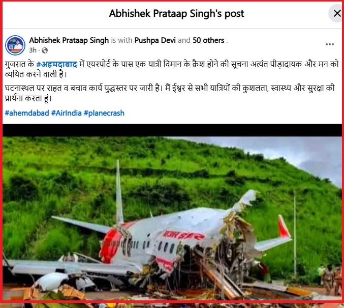 ಅಹಮದಾಬಾದ್ ಅಪಘಾತದ ಬಗ್ಗೆ ವ್ಯಾಪಕ ವರದಿಗಳು ಮತ್ತು ಸಾಮಾಜಿಕ ಮಾಧ್ಯಮ ಅಪ್ಡೇಟ್ ಗಳ ನಡುವೆ, ಎರಡು ಭಾಗಗಳಾಗಿ ತುಂಡಾಗಿರುವ ತೀವ್ರವಾಗಿ ಹಾನಿಗೊಳಗಾದ ವಿಮಾನವನ್ನು ತೋರಿಸುವ ಛಾಯಾಚಿತ್ರವನ್ನು ಅಂತರ್ಜಾಲದಲ್ಲಿ ವ್ಯಾಪಕವಾಗಿ ಹಂಚಿಕೊಳ್ಳಲಾಗಿತ್ತು. ಫೇಸ್ಬುಕ್ನಲ್ಲಿರುವ ಚಿತ್ರದೊಂದಿಗೆ ಹಿಂದಿ ಭಾಷೆಯಲ್ಲಿ ಒಂದು ಸಂದೇಶವನ್ನೂ ಕಾಣಬಹುದು, ಈ ಸಂದೇಶವು ಘಟನೆಯ ಬಗ್ಗೆ ತೀವ್ರ ದುಃಖವನ್ನು ವ್ಯಕ್ತಪಡಿಸುತ್ತಾ ಪ್ರಯಾಣಿಕರ ಸುರಕ್ಷತೆಗಾಗಿ ಪ್ರಾರ್ಥನೆಯನ್ನು ಸೂಚಿಸುತ್ತದೆ. ಇದು, ಚಿತ್ರವು ಜೂನ್ 12, 2025 ರಂದು ಅಹಮದಾಬಾದ್ ಬಳಿ ನಡೆದ ಅಪಘಾತಕ್ಕೆ ಸಂಬಂಧಿಸಿದ್ದು ಎಂಬುದನ್ನು ಸೂಚಿಸುತ್ತದೆ.