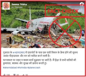 ಜೂನ್ 12, 2025 ರಂದು ಸರ್ದಾರ್ ವಲ್ಲಭಭಾಯಿ ಪಟೇಲ್ ಅಂತಾರಾಷ್ಟ್ರೀಯ ವಿಮಾನ ನಿಲ್ದಾಣದಿಂದ ಟೇಕ್ ಆಫ್ ಆದ ಕೆಲವೇ ನಿಮಿಷಗಳ ನಂತರ ಅಹಮದಾಬಾದ್ನಿಂದ ಲಂಡನ್ಗೆ ಹಾರಿದ ಏರ್ ಇಂಡಿಯಾ ವಿಮಾನ AI171ರ ದಾರುಣ ವಿಮಾನ ಅಪಘಾತದ ನಂತರ, ಸಾಮಾಜಿಕ ಮಾಧ್ಯಮದಲ್ಲಿ ಹಲವಾರು ಚಿತ್ರಗಳು ಮತ್ತು ಹೇಳಿಕೆಗಳನ್ನು ಹಂಚಿಕೊಳ್ಳಲಾಯಿತು. ಬೋಯಿಂಗ್ 787-8 ವಿಮಾನವು ಸಿಬ್ಬಂದಿ ಸೇರಿದಂತೆ 242 ಜನರನ್ನು ಹೊತ್ತೊಯ್ಯುತ್ತಿತ್ತು. ವಿಮಾನವು ವೈದ್ಯರ ಹಾಸ್ಟೆಲ್ಗೆ ಅಪ್ಪಳಿಸಿತು. ಈ ದುರಂತದಲ್ಲಿ ನೆಲದ ಮೇಲಿದ್ದವರು ಸೇರಿದಂತೆ 260 ಕ್ಕೂ ಹೆಚ್ಚು ಜನರು ಸಾವನ್ನಪ್ಪಿದರು.