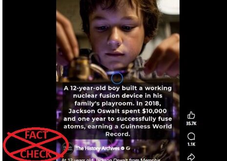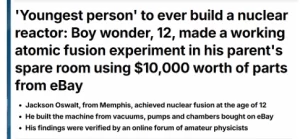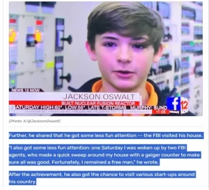 ಹೇಳಿಕೆ/Claim : 2018 ರಲ್ಲಿ 12 ವರ್ಷ ವಯಸ್ಸಿನಲ್ಲಿ, ಜಾಕ್ಸನ್ ಒಸ್ವಾಲ್ಟ್ ಒಂದು ಕಾರ್ಯನಿರ್ವಹಿಸುವ ನ್ಯೂಕ್ಲಿಯರ್ ಫ್ಯೂಜನ್ ಸಾಧನವನ್ನು ನಿರ್ಮಿಸಿ ಗಿನ್ನಿಸ್ ವಿಶ್ವ ದಾಖಲೆಯನ್ನು ಗಳಿಸಿದರು ಮತ್ತು FBI ದಾಳಿಗೂ ಒಳಗಾದರು