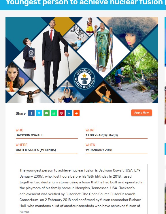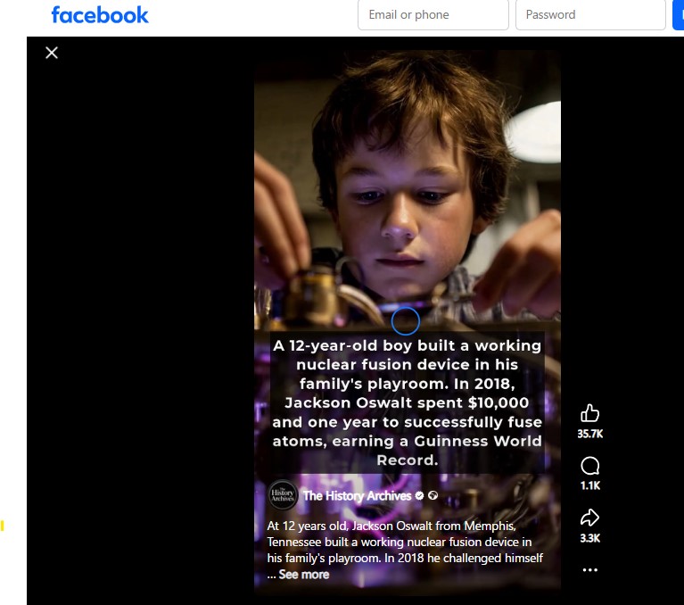 ಟೆನ್ನೆಸ್ಸೀಯ ಮೆಂಫಿಸ್ನ ಜಾಕ್ಸನ್ ಒಸ್ವಾಲ್ಟ್ 12 ವರ್ಷ ವಯಸ್ಸಿನಲ್ಲಿ, ಕುಟುಂಬದ ಆಟದ ಕೋಣೆಯಲ್ಲಿ, ಕಾರ್ಯನಿರ್ವಹಿಸುವ ನ್ಯೂಕ್ಲಿಯರ್ ಫ್ಯೂಜನ್ ಸಾಧನವನ್ನು ನಿರ್ಮಿಸಿದನೆಂದು ಹಲವಾರು ಬಳಕೆದಾರರು ಹೇಳಿಕೊಂಡಿದ್ದಾರೆ. ಫೇಸ್ಬುಕ್ನಲ್ಲಿ ದ ಹಿಸ್ಟರಿ ಆರ್ಕೈವ್ಸ್ ಮಾಡಿದ ಹೇಳಿಕೆಯ ಅನುಸಾರ 2018ರಲ್ಲಿ ಫ್ಯೂಸರ್ ಅನ್ನು ನಿರ್ಮಿಸುವ ಮೂಲಕ ನ್ಯೂಕ್ಲಿಯರ್ ಫ್ಯೂಜನ್ ಅನ್ನು ಸಾಧಿಸಲು ಆತ ಹೇಗೆ ತನಗೆ ತಾನೇ ಸವಾಲು ಹಾಕಿಕೊಂಡನು ಎಂಬುದನ್ನು ಹೇಳುತ್ತದೆ. ಫೇಸ್ಬುಕ್ ಪೋಸ್ಟ್ ಅನ್ನು ಕೆಳಗೆ ನೋಡಿ: