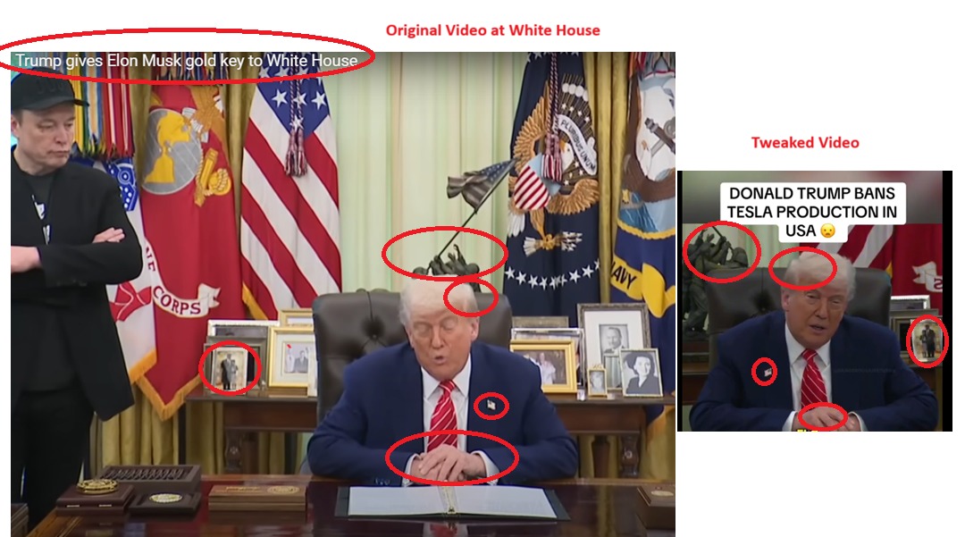 ಎರಡನೆಯದಾಗಿ, ಮಸ್ಕ್ DOGE ಕಚೇರಿಯಿಂದ ಹೊರಬಂದಾಗ ನಡೆದ ಪ್ರಮುಖ ಸಮಾರಂಭದ ವೀಡಿಯೊವನ್ನು ಎಲ್ಲಾ ರೀತಿಯಲ್ಲೂ ತಿರುಚಲಾಗಿದೆ, ಉತ್ಪ್ರೇಕ್ಷಿತ ಶೈಲಿಯಿಂದ, ನಾಟಕೀಯ ಉಪಶೀರ್ಷಿಕೆಗಳು, ಚಿತ್ರದ ತಿರುಗಿಸುವಿಕೆ, ಹಿನ್ನೆಲೆ ಬದಲಾವಣೆ ಮತ್ತು ಎಮೋಜಿಗಳವರೆಗಿನ ಬದಲಾವಣೆಯು, ಇದು ಕಾಲ್ಪನಿಕವಾಗಿದ್ದು ನಿಜವಾದ ವೀಡಿಯೊ ಅಲ್ಲ ಎಂಬುದನ್ನು ಸೂಚಿಸುತ್ತದೆ.