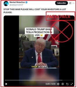 ಹೇಳಿಕೆ/Claim:ಟ್ರಂಪ್ಒಂದು ವೀಡಿಯೊದಲ್ಲಿ ಟೆಸ್ಲಾ ಉತ್ಪಾದನೆಯ ಮೇಲೆ ನಿಷೇಧವನ್ನು ಘೋಷಿಸಿದ್ದಾರೆ..