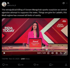 ಸೋನಮ್ ವಾಂಗ್‌ಚುಕ್ ಮರಣದ ಬಗ್ಗೆ ವರದಿ ಮಾಡುತ್ತಿರುವ ಇಂಡಿಯಾ ಟುಡೇ ಪತ್ರಕರ್ತೆ ಜೆಸ್ಸಿಕಾ ಗೋಯಲ್ ಅವರ ಕ್ಲಿಪ್ ಅನ್ನು ಹಲವಾರು ಸಾಮಾಜಿಕ ಮಾಧ್ಯಮ ಬಳಕೆದಾರರು ಹಂಚಿಕೊಂಡಿದ್ದಾರೆ. ಈ ಕ್ಲಿಪ್ ಅನ್ನು X ಬಳಕೆದಾರ ‘Mushk_0’ ಈ ಮುಂದಿನ ಶೀರ್ಷಿಕೆಯೊಂದಿಗೆ ಹಂಚಿಕೊಂಡಿದ್ದಾರೆ-“ಸೋನಮ್ ವಾಂಗ್‌ಚುಕ್ ಅವರ ಕಾನೂನುಬಾಹಿರ ಹತ್ಯೆ ಮತ್ತು ಕೇಂದ್ರ ಸಂಸ್ಥೆಗಳು ಸುದ್ದಿಯನ್ನು ನಿಗ್ರಹಿಸಲು ಪ್ರಯತ್ನಿಸುತ್ತಿರುವುದು ಅನುಮಾನವನ್ನು ಹುಟ್ಟುಹಾಕುತ್ತದೆ. ಲಡಾಖ್‌ ನಲ್ಲಿ ಪರಿಸ್ಥಿತಿ ಕಠೋರವಾಗಿದೆ, ಈ ಮೋದಿ ಆಡಳಿತವು ವಿವೇಕದ ಎಲ್ಲಾ ಮಿತಿಗಳನ್ನು ಮೀರಿದೆ”. ಪೋಸ್ಟ್ ಅನ್ನು ಕೆಳಗೆ ನೋಡಿ