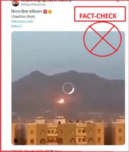 “ಆಪರೇಷನ್ ಸಿಂಧೂರ್” ಎಂಬ ಭಾರತದ ಇತ್ತೀಚಿನ ದಾಳಿಗಳ ಸಂದರ್ಭದಲ್ಲಿ ಇದನ್ನು ಹಂಚಿಕೊಳ್ಳಲಾಗಿದೆ. ವೀಡಿಯೊದ ಜೊತೆಗಿನ ಹಿಂದಿ ಶೀರ್ಷಿಕೆಯು ಹೀಗಿದೆ: “किराना हिल्स पाकिस्तान”. ಅದರ ಅನುವಾದ ಹೀಗಿದೆ: “ಕಿರಾನಾ ಹಿಲ್ಸ್ ಪಾಕಿಸ್ತಾನ (ವಿಕಿರಣ ಅಪಾಯ)” ಇದು ಭಾರತದ ದಾಳಿಯ ನಂತರ ಎಚ್ಚರಿಕೆಯನ್ನು ಸೂಚಿಸುತ್ತದೆ. ಇದನ್ನು ಇಲ್ಲಿ ಮತ್ತು ಇಲ್ಲಿ ಹಂಚಿಕೊಳ್ಳಲಾಗಿದೆ.
