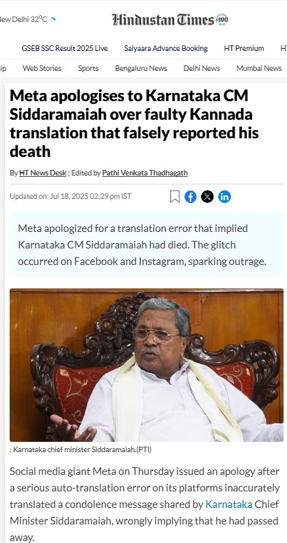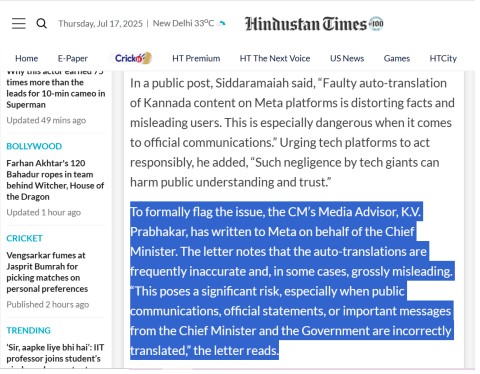 ಹಿಂದೂಸ್ತಾನ್ ಟೈಮ್ಸ್ ನ ಮತ್ತೊಂದು ವರದಿಯು ಸಿಎಂ ಸಿದ್ದರಾಮಯ್ಯನವರು ತಮ್ಮ ಮಾಧ್ಯಮ ಸಲಹೆಗಾರರಿಗೆ ತಪ್ಪು ಅನುವಾದದ ಕುರಿತು ಮೆಟಾಗೆ ದೂರು ಸಲ್ಲಿಸುವಂತೆ ಸೂಚಿಸಿದ್ದಾರೆ ಎಂದು ದೃಢೀಕರಿಸುತ್ತದೆ. ವರದಿಯ ಲಿಂಕ್ ಅನ್ನು ಇಲ್ಲಿ ನೋಡಿ ಮತ್ತು ಸಂಬಂಧಿತ ಚಿತ್ರವನ್ನೂ ಕೆಳಗೆ ಕಾಣಬಹುದು.