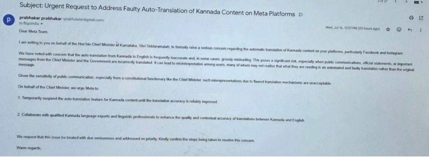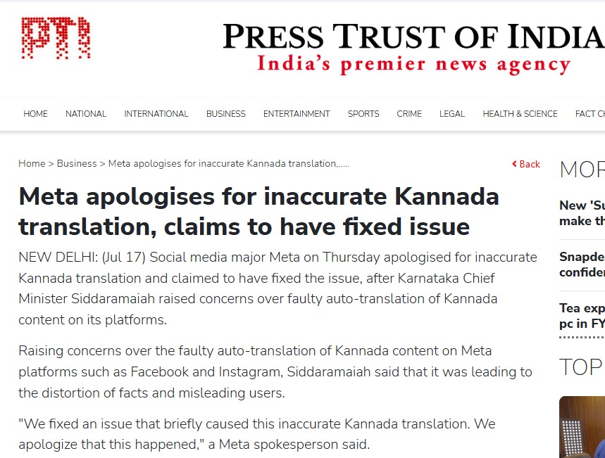Faulty auto-translation of Kannada content on @Meta platforms is distorting facts & misleading users. This is especially dangerous when it comes to official communications.