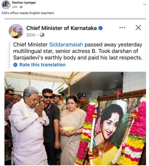 ಆ ಪೋಸ್ಟ್ ಹೀಗಿದೆ: “ಮುಖ್ಯಮಂತ್ರಿ ಸಿದ್ದರಾಮಯ್ಯ ನಿನ್ನೆ ನಿಧನರಾದರು, ಸರೋಜಾದೇವಿ ಅವರ ಪಾರ್ಥಿವ ಶರೀರದ ದರ್ಶನ ಪಡೆದು ತಮ್ಮ ಅಂತಿಮ ನಮನ ಸಲ್ಲಿಸಿದರು, ಬಹುಭಾಷಾ ತಾರೆ, ಹಿರಿಯ ನಟಿ ಬಿ.”