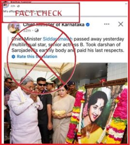 ಕರ್ನಾಟಕದ ಮುಖ್ಯಮಂತ್ರಿಗಳ ಅಧಿಕೃತ ಫೇಸ್ಬುಕ್ ಪುಟದ ಪೋಸ್ಟ್ ಅನ್ನು ತೋರಿಸುವ ಸ್ಕ್ರೀನ್ಶಾಟ್ ಆನ್ಲೈನ್ ಮಾಧ್ಯಮಗಳಲ್ಲಿ ಹರಿದಾಡುತ್ತಿದೆ. ಪೋಸ್ಟ್ನಲ್ಲಿರುವ ಆಂಗ್ಲ ಭಾಷೆ ವಿಚಿತ್ರವಾಗಿದೆ. ಅದು ಸಿಎಂ ಸಿದ್ದರಾಮಯ್ಯ ನಿಧನರಾದರು ಎಂದು ಹೇಳುತ್ತದೆ, ಮತ್ತು ನಂತರವೇ ನಟಿ ಬಿ. ಸರೋಜಾ ದೇವಿಯವರಿಗೆ ಅಂತಿಮ ನಮನ ಸಲ್ಲಿಸುವ ಬಗ್ಗೆ ಅಸಂಬದ್ಧ ವಾಕ್ಯಗಳನ್ನು ಒಳಗೊಂಡಿದೆ.
