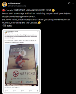 ಹಲವಾರು ಸಾಮಾಜಿಕ ಮಾಧ್ಯಮ ಬಳಕೆದಾರರು ಕೆನಡಾದಲ್ಲಿ ಭಾರತೀಯರನ್ನು ಗುರಿಯಾಗಿಸಿಕೊಂಡು ನಿರ್ಮಿಸಲಾದ ಜಾಹೀರಾತು ಫಲಕವನ್ನು ಪ್ರದರ್ಶಿಸುವ ಪೋಸ್ಟ್ ಅನ್ನು ಹಂಚಿಕೊಂಡಿದ್ದಾರೆ. ‘migrantwoodcamp’ ಎಂಬ X ಬಳಕೆದಾರರ ಅಂತಹ ಒಂದು ಪೋಸ್ಟ್ ಅನ್ನು ಹಂಚಿಕೊಂಡಿದ್ದು, ಅದರಲ್ಲಿ, ಕೆನಡಾ ला शेवटी हिंदी भाषा आत्मसात करावीच लागली ಎಂದು ಹೇಳಿದ್ದಾರೆ. ಜನರು-ಹಿಂದಿ ಜನರು (ಮತ್ಯಾರು)- ಸಮುದ್ರತೀರದಲ್ಲಿ ಮಲ ವಿಸರ್ಜನೆ ಮಾಡುವುದನ್ನು ತಡೆಯುವುದಕ್ಕಾಗಿ ಹಿಂದಿಯಲ್ಲಿ ಸಂದೇಶವನ್ನು ಹೊಂದಿರುವ ಪೋಸ್ಟರ್. ಆದರೆ ಪರವಾಗಿಲ್ಲ, ಉತ್ತರ ಭಾರತೀಯರೇ, ನೀವು ಮುಂಬೈಯ ಸಮುದ್ರತೀರಗಳನ್ನು ಹೀಗೇ ವಶಪಡಿಸಿಕೊಂಡಿದ್ದೀರಿ, ಈಗ ಕೆನಡಾಕ್ಕೆ ತನ್ನಿ. ‘टॅटी- tatty’. ಜೊತೆಯಲ್ಲಿರುವ ಚಿತ್ರದಲ್ಲಿ “ಕಡಲತೀರಗಳು ಶೌಚಾಲಯಗಳಲ್ಲ. ಇಲ್ಲಿ ಮಾಡಬೇಡಿ!” ಎಂಬ ಘೋಷಣೆಯನ್ನು ಹೊಂದಿರುವ ಬಿಲ್ಬೋರ್ಡ್ ಅನ್ನು ತೋರಿಸಲಾಗಿದೆ, ಜೊತೆಗೆ “ಬಯಲು ಮಲವಿಸರ್ಜನೆ ಮಾಡಬಾರದು” ಎಂಬ ಅನುವಾದದ ಹಿಂದಿ ಪಠ್ಯವನ್ನೂ, ಕುಳಿತಿರುವ ವ್ಯಕ್ತಿಯ ಚಿತ್ರ ಮತ್ತು ಘಾನಾ ಸರ್ಕಾರ, ಕೆನಡಾ ಮತ್ತು ಯುನಿಸೆಫ್ ಲೋಗೋಗಳನ್ನುಸಹ ಚಿತ್ರವು ತೋರಿಸುತ್ತದೆ. ಪೋಸ್ಟ್ ಅನ್ನು ಕೆಳಗೆ ವೀಕ್ಷಿಸಿ–