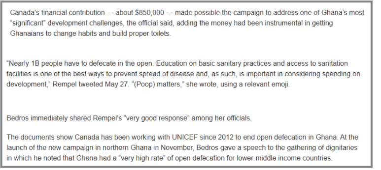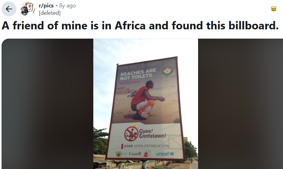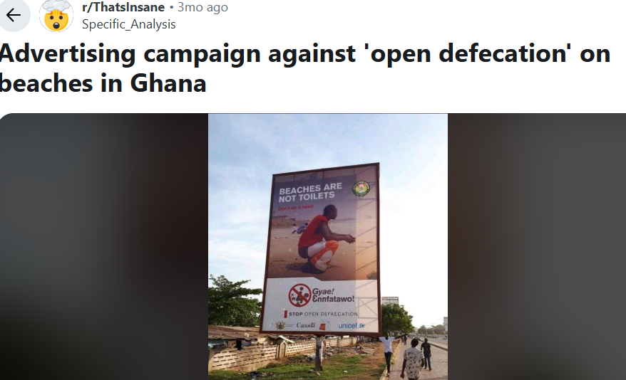 ನ್ಯಾಷನಲ್ ಪೋಸ್ಟ್ ಪ್ರಕಟಿಸಿದ ವರದಿಯಲ್ಲಿ ಈ ಚಿತ್ರವನ್ನು ಲಗತ್ತಿಸಲಾಗಿಲ್ಲ, ಆದರೆ ವಿವರಣೆಯು ಹೊಂದಿಕೆಯಾಗುತ್ತದೆ. ಉದಾಹರಣೆಗೆ, ವರದಿಯಲ್ಲಿ “ಸಾರ್ವಜನಿಕ ಆರೋಗ್ಯ ನೈರ್ಮಲ್ಯ ಯೋಜನೆಯು “ಕಡಲತೀರಗಳು ಶೌಚಾಲಯಗಳಲ್ಲ – ಇಲ್ಲಿ ಮಾಡಬೇಡಿ” ಎಂಬ ಘೋಷಣೆಯೊಂದಿಗೆ ಜನರು ಸಮುದ್ರತೀರದಲ್ಲಿ ಕುಳಿತಿರುವುದನ್ನು ತೋರಿಸುವ ದೊಡ್ಡ, ಗ್ರಾಫಿಕ್ ಬಿಲ್ಬೋರ್ಡ್ ಅನ್ನು ಒಳಗೊಂಡಿತ್ತು” ಎಂದು ಹೇಳಲಾಗಿದೆ. ಘಾನಾ ಸರ್ಕಾರ ಮತ್ತು UN ನೆರವು ಕಾರ್ಯಕ್ರಮವಾದ ಯುನಿಸೆಫ್ನ ಲೋಗೋಗಳ ಜೊತೆಗೆ ಕೆನಡಾ ಸರ್ಕಾರದ ಚಿಹ್ನೆಯನ್ನು ಕಾರ್ಯತಾಂತ್ರಿಕವಾಗಿ ಕೆಳಭಾಗದಲ್ಲಿ ಇರಿಸಲಾಗಿದೆ.” ಬಿಲ್ಬೋರ್ಡ್ ಘಾನಾದಲ್ಲಿತ್ತೇ ಹೊರತು ಕೆನಡಾದಲ್ಲಿ ಭಾರತೀಯ ಜನರ ವಿರುದ್ಧದ ಅಭಿಯಾನವಲ್ಲ ಎಂದು ಇದು ದೃಢಪಡಿಸುತ್ತದೆ.