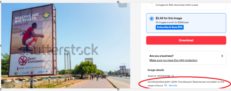ಕೊನೆಯದಾಗಿ ನಾವು, ಘಾನಾದ ಅಕ್ರಾ ಎಂದು ಟ್ಯಾಗ್ ಮಾಡಲಾದ ಇದೇ ಚಿತ್ರವನ್ನು ಶಟರ್ಸ್ಟಾಕ್ನಲ್ಲಿ ಕಂಡೆವು. ಮೇ 1, 2018 ರಂದು ಪೋಸ್ಟ್ ಮಾಡಲಾಗಿರುವ ಚಿತ್ರದ ವಿವರಣೆಯಿಂದ, ಈ ಚಿತ್ರವು “ಅಕ್ರಾದ ಬೀದಿಯಲ್ಲಿರುವ “ಕಡಲತೀರಗಳು ಶೌಚಾಲಯಗಳಲ್ಲ” ಎಂಬ ಬಿಲ್ಬೋರ್ಡ್” ಎಂದು ನಮಗೆ ತಿಳಿದುಬಂತು. ಸ್ಕ್ರೀನ್ಶಾಟ್ ಅನ್ನು ಕೆಳಗೆ ನೋಡಿ-