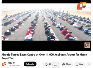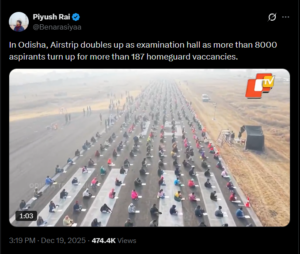 ಒಡಿಶಾದ ವಾಯುನೆಲೆಯಲ್ಲಿ ವಿದ್ಯಾರ್ಥಿಗಳು ಮೇಜು ಮತ್ತು ಕುರ್ಚಿಗಳಿಲ್ಲದೆ ಪರೀಕ್ಷೆ ಬರೆಯುತ್ತಿರುವ ಕ್ಲಿಪ್ ಅನ್ನು ಹಲವಾರು ಸಾಮಾಜಿಕ ಮಾಧ್ಯಮ ಬಳಕೆದಾರರು ಹಂಚಿಕೊಂಡಿದ್ದಾರೆ. ತೆರೆದ ರನ್ವೇಯಲ್ಲಿ ಸಾಲುಗಳಲ್ಲಿ ಕುಳಿತಿರುವ ಸಾವಿರಾರು ಅಭ್ಯರ್ಥಿಗಳನ್ನು ಚಿತ್ರಿಸುವ ಒಡಿಶಾ ಟಿವಿ (OTV) ಯ ವೀಡಿಯೊವನ್ನು ದೃಢೀಕೃತ X ಬಳಕೆದಾರ ‘Benarasiyaa’ ಎಂಬವರು ಡಿಸೆಂಬರ್ 19, 2025 ರಂದು ಹಂಚಿಕೊಂಡರು. ಶೀರ್ಷಿಕೆ ಹೀಗಿದೆ: “ಒಡಿಶಾದಲ್ಲಿ, 187ಕ್ಕೂ ಹೆಚ್ಚು ಖಾಲಿಯಿರುವ ಹೋಂಗಾರ್ಡ್ ಹುದ್ದೆಗಳಿಗಾಗಿ 8000ಕ್ಕೂ ಹೆಚ್ಚು ಆಕಾಂಕ್ಷಿಗಳು ಹಾಜರಾದಾಗ ವಾಯುನೆಲೆ ಪರೀಕ್ಷಾ ಹಾಲ್ ಆಗಿ ಬದಲಾಯಿತು.” ಪೋಸ್ಟ್ ಅನ್ನು ಕೆಳಗೆ ನೋಡಿ-