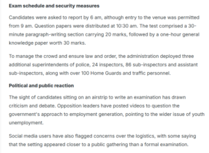 ದಿ ಇಂಡಿಯನ್ ಎಕ್ಸ್ಪ್ರೆಸ್ ಪ್ರಕಟಿಸಿದ ಮತ್ತೊಂದು ವರದಿಯಲ್ಲಿ 187 ಹೋಂಗಾರ್ಡ್ ಹುದ್ದೆಗಳಿಗಾಗಿ 8,000 ಅರ್ಜಿದಾರರು ಸ್ಪರ್ಧಿಸಿದ್ದರು ಎಂದು ದೃಢಪಡಿಸಲಾಗಿದೆ. “ಡಿಸೆಂಬರ್ 16 ರಂದು ಜಿಲ್ಲೆಯಾದ್ಯಂತ 24 ಪೊಲೀಸ್ ಠಾಣೆಗಳಿಗಾಗಿ ಸಂಬಲ್ಪುರ ಪೊಲೀಸರು ನಡೆಸಿದ ಈ ಪರೀಕ್ಷೆಯನ್ನು ಪಟ್ಟಣದ ಬಳಿಯ ಜಮದರ್ಪಾಲಿ ವಾಯುನೆಲೆಯಲ್ಲಿ ನಡೆಸಲಾಯಿತು”. ವ್ಯವಸ್ಥಾಪನೆ ಸಮಸ್ಯೆಗಳನ್ನು ಪರಿಹರಿಸಲು, “ವಾಯುನೆಲೆಯ ರನ್ವೇಯಲ್ಲಿ ಲಿಖಿತ ಪರೀಕ್ಷೆಯನ್ನು ನಡೆಸಲು ನಿರ್ಧರಿಸಲಾಯಿತು” ಎಂದು ಹಿರಿಯ ಪೊಲೀಸ್ ಅಧಿಕಾರಿಯೊಬ್ಬರು ವಿವರಿಸಿದ್ದಾರೆ ಎಂದು ವರದಿಯಲ್ಲಿ ಉಲ್ಲೇಖಿಸಲಾಗಿದೆ.