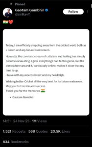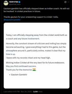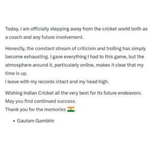 Thank you Gautam Gambhir for everything you gave to Indian cricket. Your passion, honesty and fearless attitude inspired millions. Legends don’t need positions to make an impact — your legacy will always stay with us pic.twitter.com/orTm8UojXv