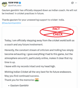 ಭಾರತೀಯ ಪುರುಷರ ಕ್ರಿಕೆಟ್ ತಂಡದ ಮುಖ್ಯ ಕೋಚ್ ಗೌತಮ್ ಗಂಭೀರ್ ರಾಜೀನಾಮೆ ನೀಡಿದ್ದಾರೆ ಎಂದು ಹಲವಾರು ಸಾಮಾಜಿಕ ಮಾಧ್ಯಮ ಬಳಕೆದಾರರು ಹೇಳಿಕೊಳ್ಳುತ್ತಿದ್ದಾರೆ. ದೃಢೀಕೃತ X ಬಳಕೆದಾರ ‘pathak_vasu’ “ಗೌತಮ್ ಗಂಭೀರ್ ಅಧಿಕೃತವಾಗಿ ಭಾರತೀಯ ಕೋಚ್ ಹುದ್ದೆಯಿಂದ ಕೆಳಗಿಳಿದಿದ್ದಾರೆ. ಅವರು ಭವಿಷ್ಯದಲ್ಲಿ ಕ್ರಿಕೆಟ್ ಅಭ್ಯಾಸಗಳಲ್ಲಿ ಭಾಗಿಯಾಗುವುದಿಲ್ಲ. ಗೌತಮ್ಗೆ ಧನ್ಯವಾದಗಳು ಕ್ರಿಕೆಟ್ ಇಂಡಿಯಾಗೆ ನಿಮ್ಮ ಅಚಲ ಬೆಂಬಲಕ್ಕಾಗಿ” ಎಂಬ ಶೀರ್ಷಿಕೆಯೊಂದಿಗೆ ಅಂತಹ ಒಂದು ಹೇಳಿಕೆಯನ್ನು ಹಂಚಿಕೊಂಡಿದ್ದಾರೆ. ಕೆಳಗಿನ ಪೋಸ್ಟ್ ಅನ್ನು ನೋಡಿ: