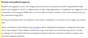 ಈ ಹೇಳಿಕೆಯ ಕುರಿತು ಇನ್ನಷ್ಟು ತಿಳಿದುಕೊಳ್ಳಲು ನಾವು ಮೊದಲು “ಶ್ರೀ ಮಾತಾ ವೈಷ್ಣೋ ದೇವಿ ಇನ್ಸ್ಟಿಟ್ಯೂಟ್ ಆಫ್ ಮೆಡಿಕಲ್ ಎಕ್ಸಲೆನ್ಸ್ ಮುಚ್ಚುವಿಕೆ” ಎಂಬ ಪದಗುಚ್ಛದೊಂದಿಗೆ ಅಂತರ್ಜಾಲ ಹುಡುಕಾಟವನ್ನು ನಡೆಸಿದೆವು. ಟೈಮ್ಸ್ ಆಫ್ ಇಂಡಿಯಾ ವರದಿಯ ಪ್ರಕಾರ, ಈ ಕಾಲೇಜು ಜಮ್ಮು ವಿಭಾಗದ ರಿಯಾಸಿ ಜಿಲ್ಲೆಯಲ್ಲಿದೆ. “42 ಮುಸ್ಲಿಂ ವಿದ್ಯಾರ್ಥಿಗಳು, ಏಳು ಹಿಂದೂ ವಿದ್ಯಾರ್ಥಿಗಳು ಮತ್ತು ಒಬ್ಬ ಸಿಖ್ಖ ವಿಧ್ಯಾರ್ಥಿ”ಯನ್ನು ನೀಟ್ ಪರೀಕ್ಷೆಯ ಮೂಲಕ ಪ್ರವೇಶ ನೀಡಲಾದ ಬಗ್ಗೆ ವರದಿಯಲ್ಲಿ ಉಲ್ಲೇಖಿಸಲಾಗಿದೆ. ಇದಲ್ಲದೆ, ಹಿಂದೂಗಳಲ್ಲದ ಅಭ್ಯರ್ಥಿಗಳನ್ನು ಹೊರಹಾಕಲು ಅಥವಾ ಕಾಲೇಜನ್ನು ಮುಚ್ಚಲು ಒತ್ತಾಯಿಸಿ ಹಿಂದೂ ಗುಂಪುಗಳಿಂದ ಪ್ರತಿಭಟನೆಗಳು ನಡೆದವು” ಒಂದು ವಿಭಾಗವನ್ನು ಕೆಳಗೆ ನೋಡಿ-