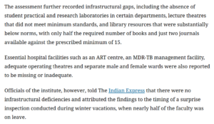 ಇಂಡಿಯನ್ ಎಕ್ಸ್ಪ್ರೆಸ್ ವರದಿಯಲ್ಲಿ ಉಲ್ಲೇಖಿಸಲಾದ ಇತರ ಕಾರಣಗಳಲ್ಲಿ ಪ್ರಮುಖ ಮೂಲಸೌಕರ್ಯ ಕೊರತೆಗಳು, ಪ್ರಾಯೋಗಿಕ ಮತ್ತು ಸಂಶೋಧನಾ ಪ್ರಯೋಗಾಲಯಗಳ ಕೊರತೆ, ಕಳಪೆ ಗುಣಮಟ್ಟದ ಉಪನ್ಯಾಸ ಕೋಣೆಗಳು, ಅತೀವ ಕಡಿಮೆ ಸಂಪನ್ಮೂಲ ಹೊಂದಿರುವ ಗ್ರಂಥಾಲಯಗಳು, ART ಕೇಂದ್ರ, MDR-TB ಸೇವೆಗಳು, ಸಾಕಷ್ಟು ಶಸ್ತ್ರಚಿಕಿತ್ಸಾ ಕೊಠಡಿಗಳು ಮತ್ತು ಪ್ರತ್ಯೇಕ ಪುರುಷ ಮತ್ತು ಮಹಿಳಾ ವಾರ್ಡ್ಗಳಂತಹ ಪ್ರಮುಖ ಆಸ್ಪತ್ರೆ ಸೌಲಭ್ಯಗಳ ಅಸಮರ್ಪಕತೆ ಕೂಡ ಸೇರಿದ್ದವು. ವರದಿಯ ಒಂದು ವಿಭಾಗವನ್ನು ಕೆಳಗೆ ನೋಡಿ: