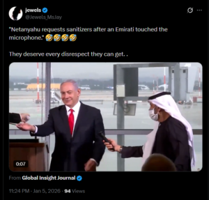 “Netanyahu requests sanitizers after an Emirati touched the microphone.” 🤣🤣🤣🤣