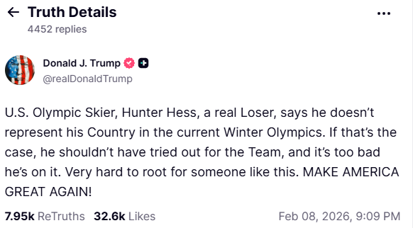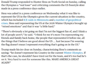 “ಸ್ನೇಹಿತರು ಮತ್ತು ಕುಟುಂಬವನ್ನು ಪ್ರತಿನಿಧಿಸುತ್ತಿದ್ದೇನೆ.. ನಾನು ಅಮೆರಿಕದ ಬಗ್ಗೆ ನಂಬುವ ವಿಷಯಗಳೆಲ್ಲಾ ಒಳ್ಳೆಯದೇ” ಆದರೆ “ನಾನು ಧ್ವಜ ಧರಿಸಿರುವ ಮಾತ್ರಕ್ಕೆ ನಾನು ಅಮೆರಿಕದಲ್ಲಿ ನಡೆಯುತ್ತಿರುವ ಎಲ್ಲವನ್ನೂ ಪ್ರತಿನಿಧಿಸುತ್ತೇನೆ ಎಂದರ್ಥವಲ್ಲ”. ಎಂದು ಆತ ಸ್ಪಷ್ಟಪಡಿಸಿದರು ಈ ಹೇಳಿಕೆಗಳ ನಂತರ, ಅಧ್ಯಕ್ಷ ಟ್ರಂಪ್ ರವರು ಟ್ರುತ್ ಸೋಶಿಯಲ್ನಲ್ಲಿ ಪ್ರತಿಕ್ರಿಯಿಸುತ್ತಾ, ಹೆಸ್ ಅವರನ್ನು ನಿಜವಾದ ಲೂಸರ್” ಆತ “ತಂಡದಲ್ಲಿರಲು ಪ್ರಯತ್ನಿಸಬಾರದಿತ್ತು” ಎಂದು ಮತ್ತು “ಇಂತಹ ವ್ಯಕ್ತಿಯನ್ನು ಬೆಂಬಲಿಸುವುದು ತುಂಬಾ ಕಷ್ಟ” ಎಂದು ಹೇಳಿದರು. ಪಾಸ್ಪೋರ್ಟ್ ರದ್ದುಗೊಳಿಸುವುದಾಗಿ ಟ್ರಂಪ್ ರವರು ಎಲ್ಲಿಯೂ ಹೇಳಿಲ್ಲ. ಪೂರ್ಣ ಪೋಸ್ಟ್ ಅನ್ನು ಇಲ್ಲಿ ನೋಡಿ:
