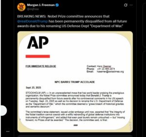 ಈ ಪೋಸ್ಟ್ ನಲ್ಲಿ ಸೆಪ್ಟೆಂಬರ್ 25, 2025 ರಂದು ಸ್ಟಾಕ್‌ಹೋಮ್‌ನಿಂದ ಅಸೋಸಿಯೇಟೆಡ್ ಪ್ರೆಸ್ (AP) ಪತ್ರಿಕಾ ಪ್ರಕಟಣೆ ನೀಡಿರುವುದು ಎನ್ನಲಾಗಿರುವ ಒಂದು ಚಿತ್ರವನ್ನು ಒಳಗೊಂಡಿದೆ. ನೊಬೆಲ್ ಪ್ರಶಸ್ತಿ ಸಮಿತಿ (NPC) ಡೊನಾಲ್ಡ್ ಜೆ. ಟ್ರಂಪ್ ರವರನ್ನು ಭವಿಷ್ಯದ ಎಲ್ಲಾ ಪ್ರಶಸ್ತಿಗಳಿಂದ ಶಾಶ್ವತವಾಗಿ ಅನರ್ಹಗೊಳಿಸಿದೆ ಎಂದದು ಹೇಳುತ್ತದೆ, ಕಾರಣ ಆತ ಯುಎಸ್ ರಕ್ಷಣಾ ಇಲಾಖೆಯನ್ನು “ಯುದ್ಧ ಇಲಾಖೆ” ಎಂದು ಮರುನಾಮಕರಣ ಮಾಡಿರುವುದು, ಇದು “ಐತಿಹಾಸಿಕ ಗುರುತ್ವಾಕರ್ಷಣೆ ಮತ್ತು ಶಬ್ದಾರ್ಥದ ಅಲಂಕಾರದ ಗಂಭೀರ ಉಲ್ಲಂಘನೆ” ಎಂದು ಬರೆಯಲಾಗಿದೆ.