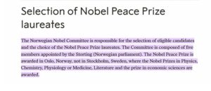 ನೊಬೆಲ್ ಶಾಂತಿ ಪ್ರಶಸ್ತಿಯನ್ನು ನಾರ್ವೇಜಿಯನ್ ನೊಬೆಲ್ ಸಮಿತಿಯು ಓಸ್ಲೋದಲ್ಲಿ ನೀಡುತ್ತದೆ, ಸ್ಟಾಕ್‌ಹೋಮ್ ನಲ್ಲಿ (ಅದು ಇತರ ಪ್ರಶಸ್ತಿಗಳನ್ನು ನಿರ್ವಹಿಸುತ್ತದೆ) .  “ಸ್ಟಾಕ್‌ಹೋಮ್ (AP)ಯಲ್ಲಿ “swisstimes.org“ನ ಕಾಲ್ಪನಿಕ ಸಂಪರ್ಕ “ಹ್ಯಾಂಜ್ ಝೀಮರ್” ಅನ್ನು ಹೊಂದಿರುವ ಹೊಂದಿರುವ ಚಿತ್ರವು ಕಟ್ಟುಕಥೆಯನ್ನು ಸೂಚಿಸುತ್ತದೆ, ಏಕೆಂದರೆ ಅಂತಹ ಯಾವುದೇ ಸಂಸ್ಥೆ ಅಥವಾ ವ್ಯಕ್ತಿ ಅಧಿಕೃತ ನೊಬೆಲ್ ಅಥವಾ AP ಸಂವಹನಗಳೊಂದಿಗೆ ಸಂಬಂಧ ಹೊಂದಿಲ್ಲ. ನೊಬೆಲ್ ಶಾಂತಿ ಪ್ರಶಸ್ತಿ ಪುರಸ್ಕೃತರ ಆಯ್ಕೆಯ ಕುರಿತು ನೊಬೆಲ್ ಪ್ರಶಸ್ತಿ ಸಂಸ್ಥೆಯ ವಿಭಾಗವನ್ನು ನೋಡಿ: