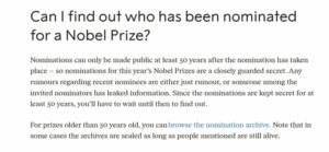 ಇದಲ್ಲದೆ, “ನಾಮನಿರ್ದೇಶನಗಳು ನಡೆದ ಕನಿಷ್ಠ 50 ವರ್ಷಗಳ ನಂತರ ಮಾತ್ರ ಸಾರ್ವಜನಿಕಗೊಳಿಸಬಹುದು – ಆದ್ದರಿಂದ ಈ ವರ್ಷದ ನೊಬೆಲ್ ಪ್ರಶಸ್ತಿ ನಾಮನಿರ್ದೇಶನಗಳು ಗೂಢವಾಗಿರಿಸಲ್ಪಟ್ಟ ರಹಸ್ಯವಾಗಿದೆ” ಎಂದು ನೊಬೆಲ್ ಪ್ರಶಸ್ತಿ ಸಂಸ್ಥೆಯು ಸ್ಪಷ್ಟವಾಗಿ ಹೇಳುತ್ತದೆ. ಇದರ ಸ್ಕ್ರೀನ್‌ಶಾಟ್ ನೋಡಿ: