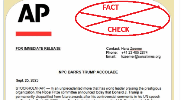 ಈ ಪೋಸ್ಟ್ ನಲ್ಲಿ ಸೆಪ್ಟೆಂಬರ್ 25, 2025 ರಂದು ಸ್ಟಾಕ್‌ಹೋಮ್‌ನಿಂದ ಅಸೋಸಿಯೇಟೆಡ್ ಪ್ರೆಸ್ (AP) ಪತ್ರಿಕಾ ಪ್ರಕಟಣೆ ನೀಡಿರುವುದು ಎನ್ನಲಾಗಿರುವ ಒಂದು ಚಿತ್ರವನ್ನು ಒಳಗೊಂಡಿದೆ. ನೊಬೆಲ್ ಪ್ರಶಸ್ತಿ ಸಮಿತಿ (NPC) ಡೊನಾಲ್ಡ್ ಜೆ. ಟ್ರಂಪ್ ರವರನ್ನು ಭವಿಷ್ಯದ ಎಲ್ಲಾ ಪ್ರಶಸ್ತಿಗಳಿಂದ ಶಾಶ್ವತವಾಗಿ ಅನರ್ಹಗೊಳಿಸಿದೆ ಎಂದದು ಹೇಳುತ್ತದೆ, ಕಾರಣ ಆತ ಯುಎಸ್ ರಕ್ಷಣಾ ಇಲಾಖೆಯನ್ನು “ಯುದ್ಧ ಇಲಾಖೆ” ಎಂದು ಮರುನಾಮಕರಣ ಮಾಡಿರುವುದು, ಇದು “ಐತಿಹಾಸಿಕ ಗುರುತ್ವಾಕರ್ಷಣೆ ಮತ್ತು ಶಬ್ದಾರ್ಥದ ಅಲಂಕಾರದ ಗಂಭೀರ ಉಲ್ಲಂಘನೆ” ಎಂದು ಬರೆಯಲಾಗಿದೆ.
