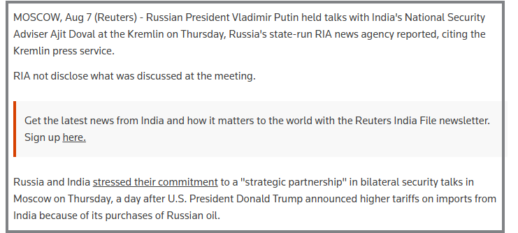 ಇದರ ನಂತರ, ಆಗಸ್ಟ್ 7, 2025ರ ರಾಯಿಟರ್ಸ್ನ ಮತ್ತೊಂದು ವರದಿಯು ನಮ್ಮ ಗಮನಕ್ಕೆ ಬಂತು, ಇದು ಭಾರತದ ಮೇಲೆ US 50% ಸುಂಕ ಹೇರುವ ಸಮಯದಲ್ಲಿ ದೋವಲ್ ರವರು ರಷ್ಯಾಗೆ ಭೇಟಿ ನೀಡಿದ ಸುದ್ದಿಯನ್ನು ಒಳಗೊಂಡಿದೆ. US ಸುಂಕಗಳನ್ನು ವಿಧಿಸಿದ ನಂತರ “ದ್ವಿಪಕ್ಷೀಯ ಭದ್ರತಾ ಮಾತುಕತೆಗಳಲ್ಲಿ “ಕಾರ್ಯತಾಂತ್ರಿಕ ಪಾಲುದಾರಿಕೆ”ಗೆ ತಮ್ಮ ಬಾಧ್ಯತೆಯನ್ನು ರಷ್ಯಾ ಮತ್ತು ಭಾರತವು ಒತ್ತಿಹೇಳಿವೆ” ಎಂದು ವರದಿಯು ಹೇಳುತ್ತದೆ. ಆದರೆ, ಅಮೆಜಾನ್ ಬಹಿಷ್ಕಾರದ ಬಗ್ಗೆ ಅಥವಾ ಅಜಿತ್ ದೋವಲ್ ರವರು ಅಂತಹ ಯಾವುದೇ ಸಲಹೆ ನೀಡಿರುವುದರ ಬಗ್ಗೆ ಯಾವುದೇ ಉಲ್ಲೇಖಗಳಿಲ್ಲ. ವರದಿಯ ಒಂದು ಭಾಗವನ್ನು ಕೆಳಗೆ ನೋಡಿ-
