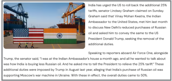 ಸೆನೆಟರ್ ಲಿಂಡ್ಸೆ ಗ್ರಹಾಂ ಹೇಳಿರುವಂತೆ, “ಭಾರತವು ಹೆಚ್ಚುವರಿ 25% ಸುಂಕಗಳನ್ನು ಹಿಂದಕ್ಕೆ ಪಡೆಯುವಂತೆ ಅಮೆರಿಕವನ್ನು ಒತ್ತಾಯಿಸಿದೆ” ಎಂದು ಜನವರಿ 5, 2026 ರಂದು ಪ್ರಕಟವಾದ TOI ವರದಿಯಲ್ಲಿ ಉಲ್ಲೇಖಿಸಲಾಗಿದೆ. ರಾಯಭಾರಿ ವಿನಯ್ ಮೋಹನ್ ಕ್ವಾತ್ರಾ ರವರು ಅಮೆರಿಕದ ಅಧಿಕಾರಿಗಳೊಂದಿಗೆ ಮಾತುಕತೆಗಳಲ್ಲಿ ಸುಂಕ ಪರಿಹಾರವನ್ನು ಒತ್ತಾಯಿಸುತ್ತಾ, “ಭಾರತವು ರಷ್ಯಾದ ತೈಲವನ್ನು ಕಡಿಮೆ ಖರೀದಿಸುತ್ತಿದೆ” ಎಂಬುದನ್ನು ಎತ್ತಿ ತೋರಿಸಿದ್ದಾರೆ ಎಂಬುದನ್ನು ಭಾರತದ ಅಧಿಕೃತ ವ್ಯಾಪಾರ ಪ್ರತಿಕ್ರಿಯೆಗಳಲ್ಲಿ ಒಳಪಡಿಸಲಾಗಿದೆ. ಆದರೆ, ಅಜಿತ್ ದೋವಲ್ ರವರ ನಿರ್ದೇಶನದ ಮೇರೆಗೆ ಅಮೆಜಾನ್ ಅನ್ನು ಬಹಿಷ್ಕರಿಸುವುದು ಅಥವಾ ತೆಗೆದುಹಾಕುವುದು ಮುಂತಾದ US ಸಂಸ್ಥೆಗಳ ವಿರುದ್ಧ ಯಾವುದೇ ಗ್ರಾಹಕ ಕ್ರಮಗಳನ್ನು ವರದಿಯಲ್ಲಿ ಉಲ್ಲೇಖಿಸಲಾಗಿಲ್ಲ. ವರದಿಯ ಒಂದು ಭಾಗವನ್ನು ಕೆಳಗೆ ನೋಡಿ: