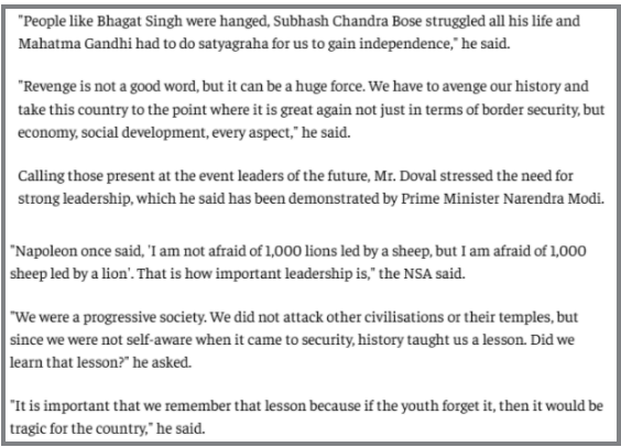 ಜನವರಿ 10, 2026ರಂದು ಪ್ರಕಟವಾದ ದ ಹಿಂದೂ ಪತ್ರಿಕೆಯ ವರದಿಯ ಪ್ರಕಾರ, ಅಜಿತ್ ದೋವಲ್ ರವರು ಬಲವಾದ ಭಾರತವನ್ನು ನಿರ್ಮಿಸುವೆಡೆಗೆ ಒತ್ತು ನೀಡಿದರು, ಆದರೆ ಸುಂಕಗಳು, ಅಮೆಜಾನ್ ಅಥವಾ ಬಹಿಷ್ಕಾರಗಳ ಬಗ್ಗೆ ಯಾವುದೇ ಮಾತನಾಡಲಿಲ್ಲ. “ನಾವು ನಮ್ಮ ಇತಿಹಾಸಕ್ಕಾಗಿ ಸೇಡು ತೀರಿಸಿಕೊಳ್ಳಬೇಕು ಮತ್ತು ಈ ದೇಶವನ್ನು ಪುನಃ ಶ್ರೇಷ್ಠತೆಯ ಉತ್ತುಂಗಕ್ಕೆ ಕೊಂಡೊಯ್ಯಬೇಕು- ಕೇವಲ ಗಡಿ ಭದ್ರತೆಯ ವಿಷಯದಲ್ಲಿ ಮಾತ್ರವಲ್ಲದೆ, ಆರ್ಥಿಕತೆ, ಸಾಮಾಜಿಕ ಅಭಿವೃದ್ಧಿ, ಪ್ರತಿಯೊಂದು ಅಂಶದಲ್ಲೂ” ಎಂದು ದೋವಲ್ ಹೇಳಿದರು ಎಂದು ವರದಿಯಲ್ಲಿ ಉಲ್ಲೇಖಿಸಲಾಗಿದೆ.