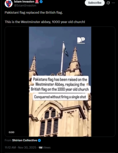 ವೆಸ್ಟ್ಮಿನಿಸ್ಟರ್ ಅಬಿಯಲ್ಲಿ ಪಾಕಿಸ್ತಾನದ ಧ್ವಜವು ಬ್ರಿಟಿಷ್ ಧ್ವಜದ ಬದಲಿಗೆ ಹಾರಿದೆ ಎಂಬ ಹೇಳಿಕೆಗಳನ್ನು ಹಲವಾರು ಸಾಮಾಜಿಕ ಮಾಧ್ಯಮ ಬಳಕೆದಾರರು ಹಂಚಿಕೊಂಡಿದ್ದಾರೆ. ದೃಢೀಕೃತ X ಬಳಕೆದಾರ ‘IslamInvasion’ ಅಂತಹ ಪೋಸ್ಟ್ ಮತ್ತು ಕ್ಲಿಪ್ ಅನ್ನು ಹಂಚಿಕೊಂಡಿದ್ದಾರೆ, ಅದರ ಶೀರ್ಷಿಕೆ ಹೀಗಿದೆ: “ಪಾಕಿಸ್ತಾನಿ ಧ್ವಜವನ್ನು ಬ್ರಿಟಿಷ್ ಧ್ವಜದ ಬದಲಾಗಿದೆ ಹಾರಿಸಲಾಗಿದೆ. ಇದು ವೆಸ್ಟ್ಮಿನಿಸ್ಟರ್ ಆಬಿ, 1000 ವರ್ಷ ಹಳೆಯ ಚರ್ಚ್!” ಅದೇ ಶೀರ್ಷಿಕೆಯೊಂದಿಗೆ ವೀಡಿಯೊವನ್ನು ಲಗತ್ತಿಸಲಾಗಿದೆ, ಇದರಲ್ಲಿ ವೆಸ್ಟ್ಮಿನಿಸ್ಟರ್ ಆಬಿಯ ಉತ್ತರ ಗೋಪುದರದ ಮೇಲೆ ಪಾಕಿಸ್ತಾನದ ಧ್ವಜವನ್ನು ಹಾರಿಸುತ್ತಿರುವ ದೃಶ್ಯಗಳನ್ನು ಪ್ರದರ್ಶಿಸಲಾಗಿದೆ. ಈ ಪೋಸ್ಟ್ ಒಂದು ಮಿಲಿಯಕ್ಕಿಂತಲೂ ಹೆಚ್ಚು ವೀಕ್ಷಣೆಗಳನ್ನು ಗಳಿಸಿದೆ, ಇದನ್ನು ಕೆಳಗೆ ವೀಕ್ಷಿಸಬಹುದು