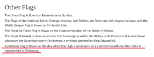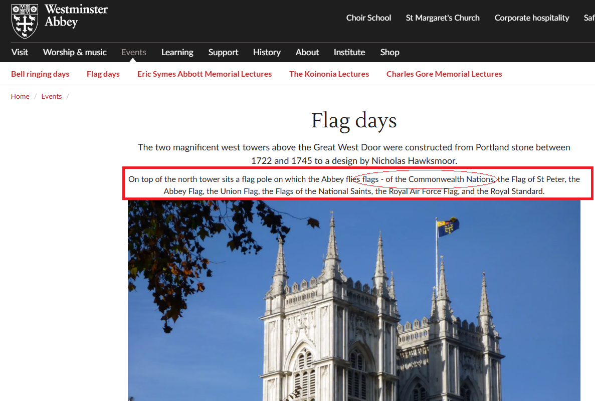 ಇದನ್ನನುಸರಿಸಿ, ವೆಸ್ಟ್ಮಿನಿಸ್ಟರ್ ಆಬಿಯ ವೆಬ್ಸೈಟ್ನಲ್ಲಿ ಪ್ರಕಟವಾದ ಅಧಿಕೃತ ಧ್ವಜ ನೀತಿಯನ್ನು ನಾವು ಪರಿಶೀಲಿಸಿದೆವು. “ಕಾಮನ್ವೆಲ್ತ್ ಸದಸ್ಯ ರಾಷ್ಟ್ರದ ಹೈಕಮಿಷನ್ ಅನ್ನು ಈವ್ಸಾಂಗ್ನಲ್ಲಿ ಪ್ರತಿನಿಧಿಸುವ ದಿನದಂದು ಆ ರಾಷ್ಟ್ರೀಯ ಧ್ವಜವನ್ನು ಹಾರಿಸಲಾಗುತ್ತದೆ” ಎಂದು ನಾವು ಅರಿತುಕೊಂಡೆವು. ಈ ವಿಭಾಗದ ಸ್ಕ್ರೀನ್ಶಾಟ್ ಅನ್ನು ಕೆಳಗೆ ನೋಡಿ-