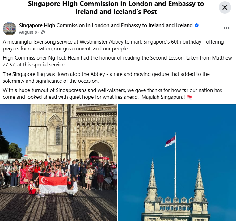 ಅದೇ ರೀತಿ, ಸಿಂಗಾಪುರ ಧ್ವಜವನ್ನು ಆಗಸ್ಟ್ 8 ರಂದು ವೆಸ್ಟ್ಮಿನಿಸ್ಟರ್ ಆಬಿಯ ಮೇಲೆ ಹಾರಿಸಲಾಯಿತು. ಪೋಸ್ಟ್ ಅನ್ನು ಕೆಳಗೆ ನೋಡಬಹುದು: