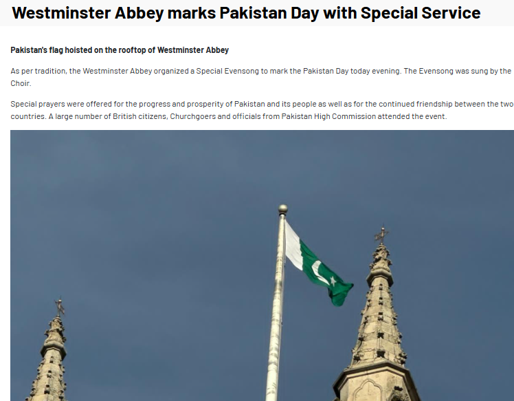 ವರದಿಯು ಹೇಳುವಂತೆ “ಪ್ರತಿ ವರ್ಷ, ವೆಸ್ಟ್ಮಿನಿಸ್ಟರ್ ಆಬಿ ಪಾಕಿಸ್ತಾನ ದಿನದಂದು ಆ ರಾಷ್ಟ್ರ, ಅದರ ನಾಯಕರು ಮತ್ತು ಜನರಿಗಾಗಿ ಪ್ರಾರ್ಥಿಸಲು ವಿಶೇಷ ಈವ್ಸಾಂಗ್ ಗೆ ಹೈ ಕಮಿಷನ್ ಅನ್ನು ಆಹ್ವಾನಿಸುತ್ತದೆ.” ಇದರ ಒಂದು ಭಾಗವನ್ನು ಕೆಳಗೆ ನೋಡಿ-