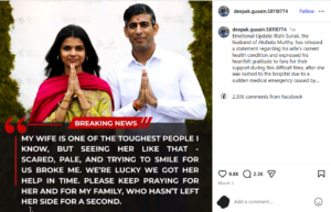 UKಯ ಮಾಜಿ ಪ್ರಧಾನಿ ರಿಷಿ ಸುನಾಕ್ ಅವರು ತಮ್ಮ ಪತ್ನಿ ಅಕ್ಷತಾ ಮೂರ್ತಿಯವರ ಅನಾರೋಗ್ಯದ ಬಗ್ಗೆ ಹೇಳಿಕೆ ಬಿಡುಗಡೆ ಮಾಡಿರುವ ಬಗ್ಗೆ ಹಲವಾರು ಸಾಮಾಜಿಕ ಮಾಧ್ಯಮ ಬಳಕೆದಾರರು ಪೋಸ್ಟ್ಗಳನ್ನು ಹಂಚಿಕೊಂಡಿದ್ದಾರೆ. ಇನ್ಸ್ಟಾಗ್ರಾಮ್ ಬಳಕೆದಾರ ‘deepak.gusain.58118774’ ಈ ಮುಂದಿನ ಶೀರ್ಷಿಕೆಯೊಂದಿಗೆ ಅಂತಹ ಹೇಳಿಕೆಯನ್ನು ಹಂಚಿಕೊಂಡಿದ್ದಾರೆ: “ಭಾವುಕ ಅಪ್ಡೇಟ್: ಅಕ್ಷತಾ ಮೂರ್ತಿಯವರ ಪತಿ ರಿಷಿ ಸುನಾಕ್, ತಮ್ಮ ಪತ್ನಿಯ ಪ್ರಸ್ತುತ ಆರೋಗ್ಯ ಸ್ಥಿತಿಯ ಬಗ್ಗೆ ಹೇಳಿಕೆಯನ್ನು ಬಿಡುಗಡೆ ಮಾಡಿದ್ದಾರೆ ಮತ್ತು ಹಠಾತ್ ವೈದ್ಯಕೀಯ ತುರ್ತು ಸ್ಥಿತಿಯಿಂದಾಗಿ ಆಕೆಯನ್ನು ಆಸ್ಪತ್ರೆಗೆ ದಾಖಲಿಸಿದ ನಂತರ ಈ ಕಷ್ಟದ ಸಮಯದಲ್ಲಿ ಅಭಿಮಾನಿಗಳು ನೀಡಿದ ಬೆಂಬಲಕ್ಕಾಗಿ ಹೃತ್ಪೂರ್ವಕ ಕೃತಜ್ಞತೆಯನ್ನು ವ್ಯಕ್ತಪಡಿಸಿದ್ದಾರೆ…” ಪೋಸ್ಟ್ನೊಂದಿಗೆ ರಿಷಿ ಸುನಾಕ್ ಅವರ ಹೇಳಿಕೆಯಂತೆ ಕಾಣುವ ಚಿತ್ರವನ್ನು ಲಗತ್ತಿಸಲಾಗಿದೆ. ಪೋಸ್ಟ್ ಅನ್ನು ಕೆಳಗೆ ನೋಡಿ-