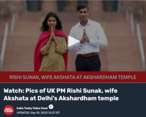 ಹೇಳಿಕೆಯಲ್ಲಿ ಬಳಸಲಾದ ಚಿತ್ರದ ವಿಷಯದಲ್ಲಿ ನಡೆಸಿದ ಹುಡುಕಾಟದಲ್ಲಿ ನಮಗೆ ಇಂಡಿಯಾ ಟುಡೇಯ ವರದಿ ಕೈಸಿಕ್ಕಿತು, ಇದನ್ನು ಕೊನೆಯದಾಗಿ ಸೆಪ್ಟೆಂಬರ್ 10, 2023ರಂದು ನವೀಕರಿಸಲಾಗಿದೆ. ಅದರಲ್ಲಿರುವ ಚಿತ್ರದಲ್ಲಿ, ಎರಡು ದಿನಗಳ G20 ಶೃಂಗಸಭೆಯ ಸಮಯದಲ್ಲಿ ದೆಹಲಿಯ ಅಕ್ಷರಧಾಮ ದೇವಾಲಯದಲ್ಲಿ ಮಾಜಿ UK ಪ್ರಧಾನಿ ರಿಷಿ ಸುನಾಕ್ ಮತ್ತು ಪತ್ನಿ ಅಕ್ಷತಾ ಮೂರ್ತಿಯವರನ್ನು ತೋರಿಸಲಾಗಿದೆ. ಇದರ ಸ್ಕ್ರೀನ್ಶಾಟ್ ಅನ್ನು ಕೆಳಗೆ ಕಾಣಬಹುದು-