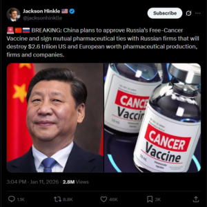 ಚೀನಾ ದೇಶವು ರಷ್ಯಾದ ಉಚಿತ-ಕ್ಯಾನ್ಸರ್ ಲಸಿಕೆಯನ್ನು ಅನುಮೋದಿಸಲು ಯೋಜಿಸುತ್ತಿದೆ ಎಂದು ಹಲವಾರು ಸಾಮಾಜಿಕ ಮಾಧ್ಯಮ ಬಳಕೆದಾರರು ಹೇಳಿಕೊಂಡಿದ್ದಾರೆ. ದೃಢೀಕೃತ X ಬಳಕೆದಾರ ‘jacksonhinklle’ ಅಂತಹ ಒಂದು ಹೇಳಿಕೆಯನ್ನು ನೀಡಿದ್ದು, ಚೀನಾ ದೇಶವು ರಷ್ಯಾದ ಸಂಸ್ಥೆಗಳೊಂದಿಗೆ ಪರಸ್ಪರ ಔಷಧೀಯ ಸಂಬಂಧಗಳಿಗೆ ಸಹಿ ಹಾಕಲಿದ್ದು ಇದು $2.6 ಲಕ್ಷ ಕೋಟಿಯಷ್ಟು US ಮತ್ತು ಯುರೋಪಿನ ಔಷಧೀಯ ಮೌಲ್ಯವನ್ನು ನಾಶಪಡಿಸುತ್ತದೆ ಮತ್ತು ಎರಡು ವರ್ಷಗಳಲ್ಲಿ $1 ಲಕ್ಷ ಕೋಟಿಯ ಆದಾಯವನ್ನು ಗಳಿಸುವ ಲಸಿಕೆಗಳನ್ನು ಜಂಟಿಯಾಗಿ ಉತ್ಪಾದಿಸುತ್ತದೆ ಎಂದು ಆರೋಪಿಸಿದ್ದಾರೆ. ಈ ಪೋಸ್ಟ್ ಗೆ ಸುಮಾರು 2.8 ಮಿಲಿಯ ವೀಕ್ಷಣೆಗಳು ದೊರಕಿದ್ದು, ಅದನ್ನು ಕೆಳಗೆ ನೋಡಬಹುದು –