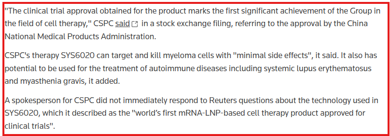 ಹೆಚ್ಚಿನ ಮಾಹಿತಿ ತಿಳಿದುಕೊಳ್ಳಲು “ರಷ್ಯಾದ ಉಚಿತ ಕ್ಯಾನ್ಸರ್ ಲಸಿಕೆಗೆ ಚೀನಾ ಅನುಮೋದನೆ” ಎಂಬ ಪದಗಳೊಂದಿಗೆ ನಾವು ಮೊದಲು ಅಂತರ್ಜಾಲ ಹುಡುಕಾಟವನ್ನು ನಡೆಸಿದೆವು. ಅಧಿಕೃತ ಹೇಳಿಕೆಗಳಿಗಾಗಿ ಹುಡುಕಾಟ ನಡೆಸಿದಾಗ ಚೀನಾ ಯಾವುದೇ ರಷ್ಯಾದ ಕ್ಯಾನ್ಸರ್ ಲಸಿಕೆಯನ್ನು ಅನುಮೋದಿಸುತ್ತಿದೆ ಎಂಬುದರ ದೃಢೀಕರಣ ದೊರೆತಿಲ್ಲ. ಜೂನ್ 26, 2024 ರಂದು ಪ್ರಕಟವಾದ ರಾಯಿಟರ್ಸ್ ವರದಿಯ ಪ್ರಕಾರ, ಚೀನಾ ದೇಶವು ಮಾನವ ಪ್ರಯೋಗಗಳಿಗಾಗಿ ಒಂದು ಅದ್ಭುತ mRNA ಕ್ಯಾನ್ಸರ್ ಚಿಕಿತ್ಸೆಯನ್ನು ಮುಂದಾಗಿಸಿದೆ. CSPC ಯ SYS6020 “ಕ್ಲಿನಿಕಲ್ ಪ್ರಯೋಗಗಳಿಗೆ ಅನುಮೋದಿಸಲಾದ ವಿಶ್ವದ ಮೊದಲ mRNA-LNP-ಆಧಾರಿತ ಕೋಶ ಚಿಕಿತ್ಸಾ ಉತ್ಪನ್ನವಾಗಿದೆ” ಮತ್ತು ಇದು ಕನಿಷ್ಠ ಅಡ್ಡಪರಿಣಾಮಗಳೊಂದಿಗೆ “ಮೈಲೋಮಾ ಕೋಶಗಳನ್ನು ಗುರಿಯಾಗಿಸಿ ಕೊಲ್ಲಬಹುದಾಗಿದೆ”. ರಷ್ಯಾದ ದಾಖಲೆ ಇರುವ ಯಾವುದೇ ಅನುಮೋದನೆಗಳಿಲ್ಲ, ವರದಿಯ ಒಂದು ಭಾಗವನ್ನು ಕೆಳಗೆ ನೋಡಿ-