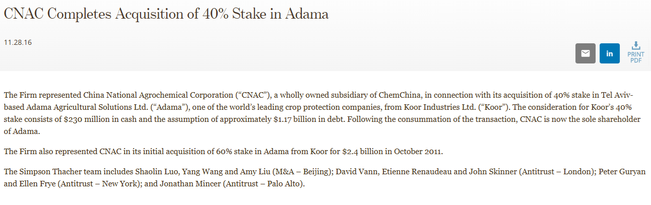 - ಚೀನಾ ರಾಷ್ಟ್ರೀಯ ಕೃಷಿ ರಾಸಾಯನಿಕ ನಿಗಮವು (CNAC) ಅಕ್ಟೋಬರ್ 2011ರಲ್ಲಿ ಅಡಾಮಾ ಅಗ್ರಿಕಲ್ಚರಲ್ ಸೊಲ್ಯೂಷನ್ಸ್ ನಲ್ಲಿ (ಕೂರ್) 2.4 ಬಿಲಿಯ ಯುಎಸ್ ಡಾಲರ್ ಹೂಡಿಕೆ ಮಾಡಿತು.