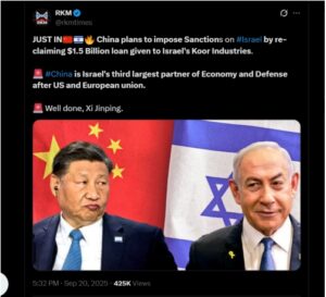 ಸಾಮಾಜಿಕ ಜಾಲತಾಣದಾದ್ಯಂತ ಬಳಕೆದಾರರು ಚೀನಾ ದೇಶವು ಇಸ್ರೇಲ್ ಮೇಲೆ ನಿರ್ಬಂಧಗಳನ್ನು ವಿಧಿಸುವ ಮತ್ತು ಇಸ್ರೇಲ್ನ ಕೂರ್ ಇಂಡಸ್ಟ್ರೀಸ್ಗೆ ನೀಡಲಾದ $1.5 ಬಿಲಿಯ ಸಾಲವನ್ನು ಮರಳಿ ಪಡೆಯುವ ಬಗ್ಗೆ ಹೇಳಿಕೆಗಳನ್ನು ಹಂಚಿಕೊಂಡಿದ್ದಾರೆ. ದೃಢೀಕೃತ X ಬಳಕೆದಾರ ‘rkmtimes’ ಸೆಪ್ಟೆಂಬರ್ 20, 2025 ರಂದು ಅಂತಹ ಹೇಳಿಕೆಯನ್ನು ಮಾಡಿದ್ದಾರೆ. “ಯುನೈಟೆಡ್ ಸ್ಟೇಟ್ಸ್ ಮತ್ತು ಯುರೋಪಿಯನ್ ಒಕ್ಕೂಟದ ನಂತರ ಚೀನಾ ದೇಶವು ಇಸ್ರೇಲ್ನ ಮೂರನೇ ಅತಿದೊಡ್ಡ ಆರ್ಥಿಕ ಮತ್ತು ರಕ್ಷಣಾ ಪಾಲುದಾರ” ಎಂಬುದನ್ನು ಶೀರ್ಷಿಕೆಯು ಒತ್ತಿಹೇಳುತ್ತದೆ.