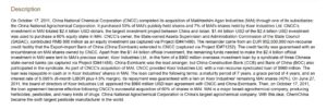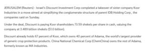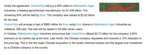 ಇದರ ನಂತರ, “ಪ್ರಮುಖ ಕೃಷಿ ರಾಸಾಯನಿಕ ತಯಾರಕರಾದ ಕೆಮ್ಚೈನಾ ಸಂಸ್ಥೆಯು $1.438 ಮೌಲ್ಯಕ್ಕೆ ಮಖ್ತೆಶಿಮ್ ಅಗಾನ್ ಇಂಡಸ್ಟ್ರೀಸ್ನಲ್ಲಿ 60% ಪಾಲನ್ನು ಖರೀದಿಸಲಿದೆ. ಉಳಿದ 40% ಕೂರ್ನ ಕೈಯಲ್ಲಿರುತ್ತದೆ” ಎಂದು ದೃಢಪಡಿಸುವ ಆಗ್ನ್ಯೂಸ್ ವರದಿಯನ್ನು ನಮಗೆ ಸಿಕ್ಕಿತು. “ಮಖ್ತೆಶಿಮ್ ಅಗಾನ್ ಇಂಡಸ್ಟ್ರೀಸ್ನಲ್ಲಿ ಕೂರ್ ಷೇರುಗಳನ್ನು ಬಳಸಿಕೊಂಡು ಕೆಮ್ಚೈನಾ ಕೂರ್ಗಾಗಿ $960 ಮಿಲಿಯನ್ ಸಾಲವನ್ನು ವ್ಯವಸ್ಥೆ ಮಾಡಲಿದೆ…” ಎಂದೂ ಸಹ ವರದಿಯು ನಮೂದಿಸಿತ್ತು. ವರದಿಯ ಒಂದು ತುಣುಕನ್ನು ಕೆಳಗೆ ನೋಡಿ-