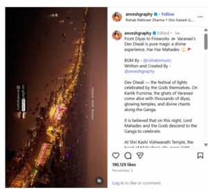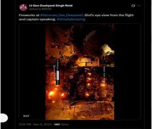 “#ವಾರಣಾಸಿ_ದೇವ್_ದೀಪಾವಳಿಯಲ್ಲಿ ಪಟಾಕಿಗಳು. ವಿಮಾನದಿಂದ ಪಕ್ಷಿ ನೋಟ ಮತ್ತು ವರ್ಣಿಸುತ್ತಿರುವ ಕ್ಯಾಪ್ಟನ್. #SimplyAmazing” ಆಡಿಯೋ ನಿರೂಪಣೆಯು ಪೈಲಟ್ ಘೋಷಣೆಯನ್ನು ಅನುಕರಿಸುತ್ತದೆ: “ಗುಡ್ ಈವನಿಂಗ್ ಲೇಡೀಸ್ ಆಂಡ್ ಜೆಂಟಲ್ಮೆನ್, ನಾನು ನಿಮ್ಮ ಕ್ಯಾಪ್ಟನ್ ಮಾತಾಡುತ್ತಿದ್ದೇನೆ… ನಾವು ಇತಿಹಾಸಕ್ಕಿಂತ ಹಳೆಯದಾದ ವಾರಣಾಸಿ ನಗರದಲ್ಲಿ ಇಳಿಯಲಿದ್ದೇವೆ.” ಪೋಸ್ಟ್ ಅನ್ನು ಕೆಳಗೆ ನೋಡಿ-
