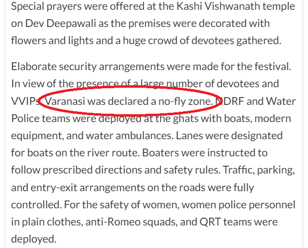 ಇದಲ್ಲದೆ, ನವೆಂಬರ್ 6, 2025 ರಂದು ಹಿಂದೂಸ್ತಾನ್ ಟೈಮ್ಸ್ ಪ್ರಕಟಿಸಿದ ವರದಿಯಿಂದ ತಿಳಿದುಬಂದದ್ದೇನೆಂದರೆ, ವಾರಣಾಸಿಯನ್ನು ಹಾರಾಟ ನಿಷೇಧಿತ ವಲಯವಾಗಿ ಘೋಷಿಸಲಾಗಿದೆ ಎಂದು. ಹಿಂದಿನ ವರ್ಷಗಳಲ್ಲಿಯೂ ಸಹ ಇದೇ ಸಂಭವಿಸಿತ್ತು, ಆ ಸಮಯ್ದದಲ್ಲಿ ಜನಸಂದಣಿಯ ಸುರಕ್ಷತೆ ಮತ್ತು VIP ಕಾರ್ಯಕ್ರಮಗಳ ಕಾರಣದಿಂದಾಗಿ ದೇವ್ ದೀಪಾವಳಿ ಹಬ್ಬದ ಸಮಯದಲ್ಲಿ ಡ್ರೋನ್ಗಳು ಮತ್ತು ವಿಮಾನಗಳನ್ನು ಅನುಮತಿಸಲಾಗಿರಲಿಲ್ಲ. ವರದಿಯ ಒಂದು ಭಾಗವನ್ನು ಕೆಳಗೆ ನೋಡಿ.