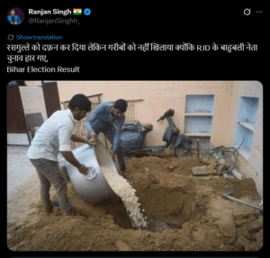 रसगुल्ले को दफ़न कर दिया लेकिन गरीबों को नहीं खिलाया क्योंकि RJD के बाहुबली नेता चुनाव हार गए,