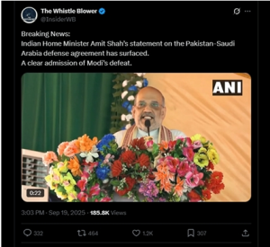 ಪೋಸ್ಟ್‌ನ ಶೀರ್ಷಿಕೆ ಹೀಗಿದೆ: “ಪಾಕಿಸ್ತಾನ-ಸೌದಿ ಅರೇಬಿಯಾ ರಕ್ಷಣಾ ಒಪ್ಪಂದದ ಕುರಿತು ಭಾರತದ ಗೃಹ ಸಚಿವ ಅಮಿತ್ ಶಾರವರ ಹೇಳಿಕೆಯು ಹೊರಬಂದಿದೆ. ಇದು ಮೋದಿಯವರ ಸೋಲಿನ ಸ್ಪಷ್ಟ ಒಪ್ಪಿಗೆ.” ಈ ಪೋಸ್ಟ್ ಗೆ 185,000ಕ್ಕೂ ಹೆಚ್ಚು ವೀಕ್ಷಣೆಗಳನ್ನು ಮತ್ತು 12,000 ಕ್ಕೂ ಹೆಚ್ಚು ಲೈಕ್‌ಗಳನ್ನು ದೊರಕಿವೆ, ಅದನ್ನು ಇಲ್ಲಿ ನೋಡಬಹುದು.