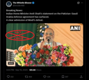 ಪೋಸ್ಟ್‌ನ ಶೀರ್ಷಿಕೆ ಹೀಗಿದೆ: “ಪಾಕಿಸ್ತಾನ-ಸೌದಿ ಅರೇಬಿಯಾ ರಕ್ಷಣಾ ಒಪ್ಪಂದದ ಕುರಿತು ಭಾರತದ ಗೃಹ ಸಚಿವ ಅಮಿತ್ ಶಾರವರ ಹೇಳಿಕೆಯು ಹೊರಬಂದಿದೆ. ಇದು ಮೋದಿಯವರ ಸೋಲಿನ ಸ್ಪಷ್ಟ ಒಪ್ಪಿಗೆ.” ಈ ಪೋಸ್ಟ್ ಗೆ 185,000ಕ್ಕೂ ಹೆಚ್ಚು ವೀಕ್ಷಣೆಗಳನ್ನು ಮತ್ತು 12,000 ಕ್ಕೂ ಹೆಚ್ಚು ಲೈಕ್‌ಗಳನ್ನು ದೊರಕಿವೆ, ಅದನ್ನು ಇಲ್ಲಿ ನೋಡಬಹುದು.